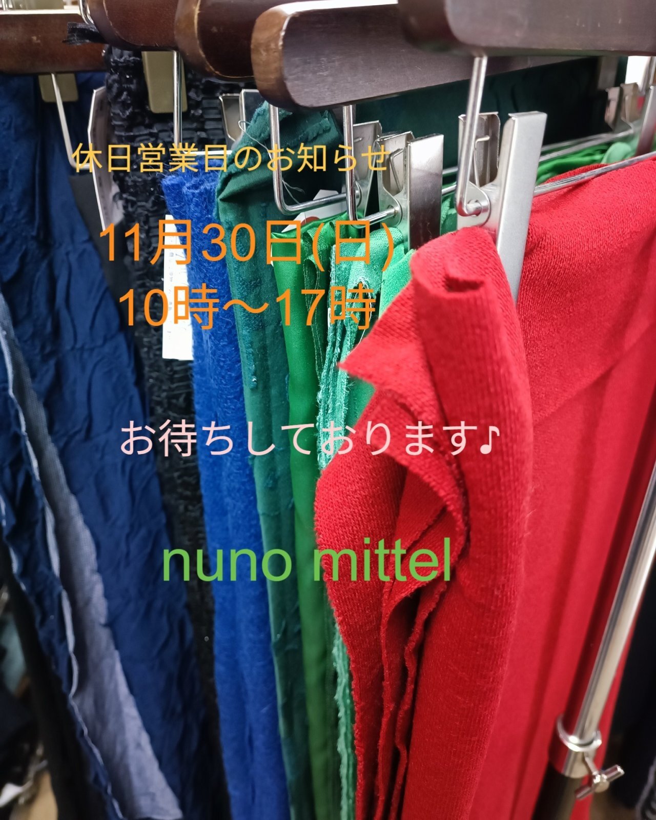 普段、お仕事・家事などで平日にご来店いただけないお客様にも是非とも生地を手に取っていただければ幸いです。