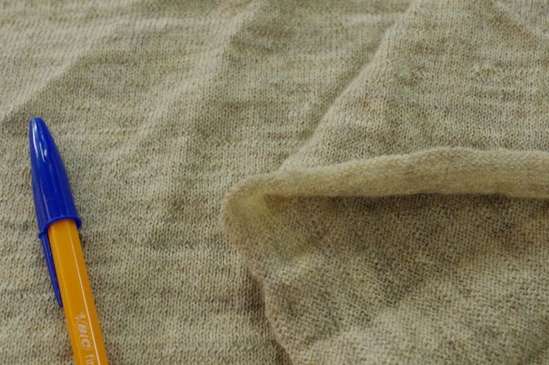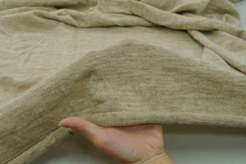 生ウールを天竺編みにした生機(キバタ)を洗いにかけ仕上げたニットになります。ウール本来の持つ素材感を楽しんでいただければと思います。  編み終わったあとに耳にガミング(糊付け)していませんので生地が丸かりやすくなっています。洗って仕上げたのでシワがございます。1m辺り1600円の生地。こちらの生地は1.0mを1点として販売しております。