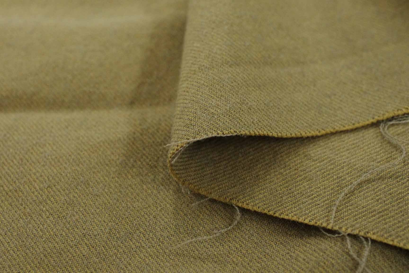 縦糸がキャメル、横糸はグレーのナチュラルカラーでコットンとウールの柔らかさと、タンブラー加工の毛羽立ち感がふんわりと感じられる綾織り生地。