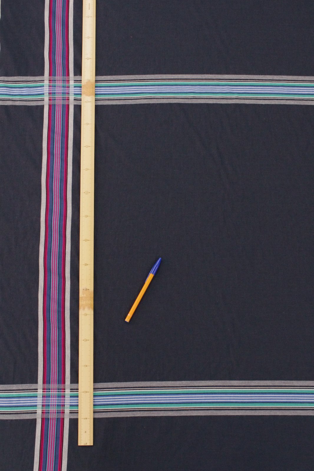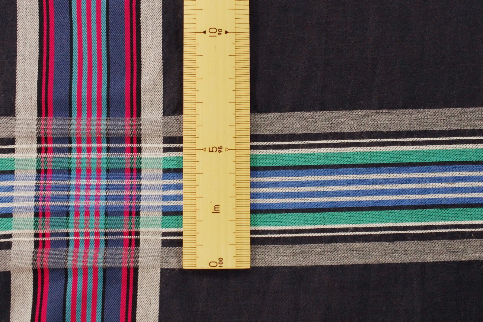 Woven using cotton and wool yarns in both plain weave and jacquard. The base color is blue-gray.